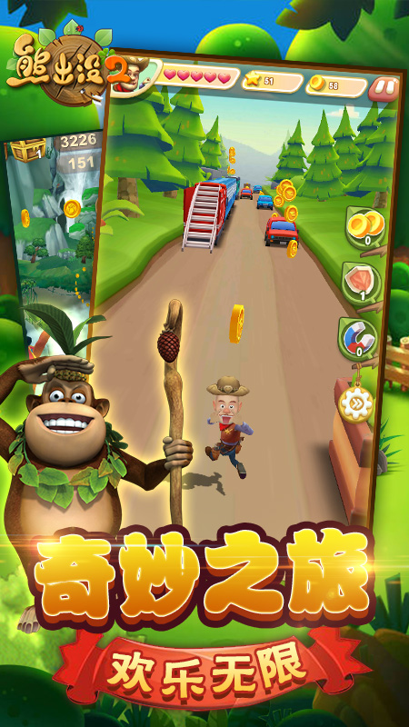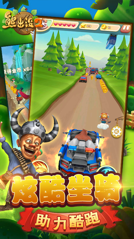 经典手游大作《熊出没2》全新归来!无厘头的搞怪剧情、让人捧腹大笑的游戏对白、高清的3D画面、狂拽酷炫的萌宠坐骑、震撼视觉的华丽特效、更多玩法尽在全新《熊出没2》!游戏根据同名动漫改编,官方正版授权,高度还原了原著动漫人物及场景。在游戏中你不仅能体会到“指尖滑动+重力感应”的混合型操作模式,还能在全新的关卡模式中体验到如同卡丁车一样的多人混战。3D画面,引领冒险跑酷,让熊出没与你一起度过!