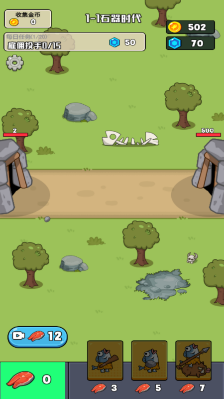 一款咸鱼怪和咸鱼之战!游戏中你需要升级你的咸鱼来对抗对方的强大咸鱼团,提升食物产出的速度,提升基地血量,来对抗敌人的攻击,慢慢升级进化从石器时代进化成为农民时代,发挥你的想象力,思考如何才能活下来吧!