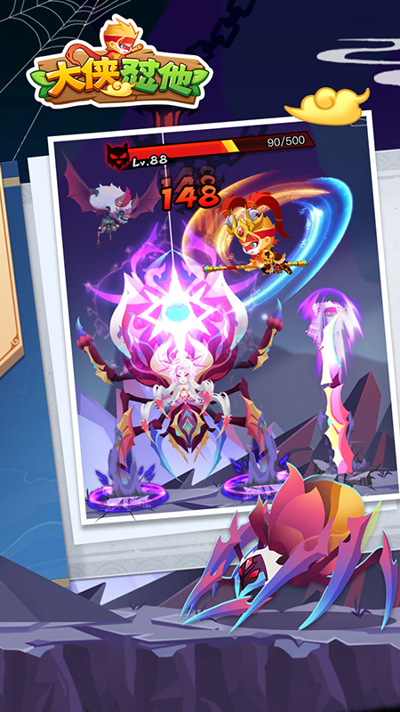 《大侠怼他》是一款画风精良的横版动作游戏。游戏中玩家扮演孙悟空的角色,在行走的旅途中遭遇黑熊、牛魔兽、野鸡等各类神兽的追击,通过击杀,技能解锁和升级等一系列动作消灭神兽,完成闯关大挑战,不断解锁新章节。