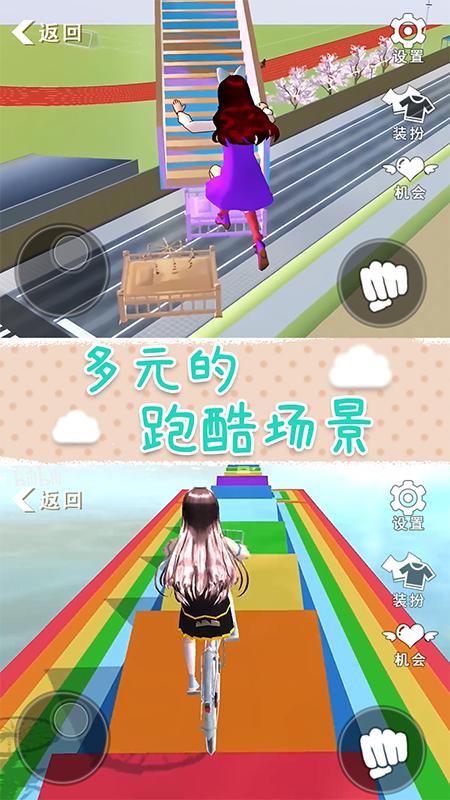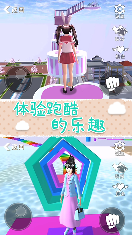 《樱花校园梦之国》是一款第三人称跑酷游戏,在游戏中穿上你最华丽最可爱最帅气服装,挑战一关关随机生成的赛道,每个随机生成的关卡难度都不同,考验你操作的时候到了;游戏中还有十多款衣服发型装饰可以自由搭配,超高自由度,搭配组合足足上百种,选择你最喜爱的风格出发去征服困难的跑酷赛道!