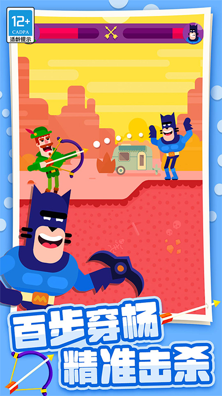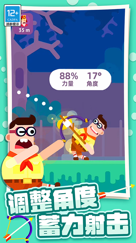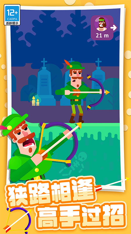 《弓箭大师》是一款即时对战射击类游戏,在游戏中,玩家将通过判断角色的相隔距离,阻挡的地形,调整自己的瞄准角度与力度,通过将手中的武器射向对手,通过武器射击到对手不同的身体部位,将造成不同的伤害,累计伤害将敌人的血条清空后,将对敌人造成晕眩状态,此时可以再获得一次对敌人发动攻击的机会,再对敌人造成伤害后,将会触发你的角色终极技能,对敌人施放一次特效酷炫的终结一击。