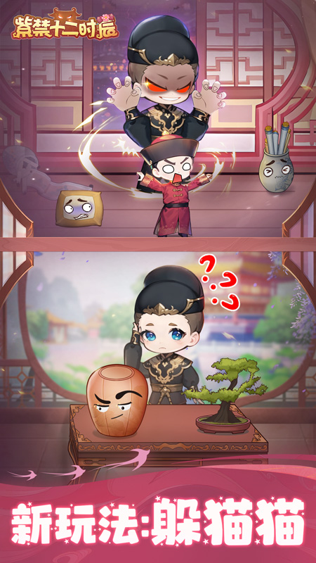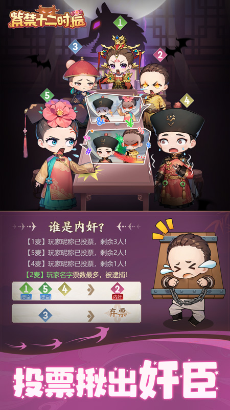 《紫禁十二时辰》是一款以中国古代为背景的休闲益智游戏。在游戏中,玩家将被划分为忠臣和反派两个阵营,各自扮演一名角色,在城中内进行各种推理博弈,最终获得游戏胜利。