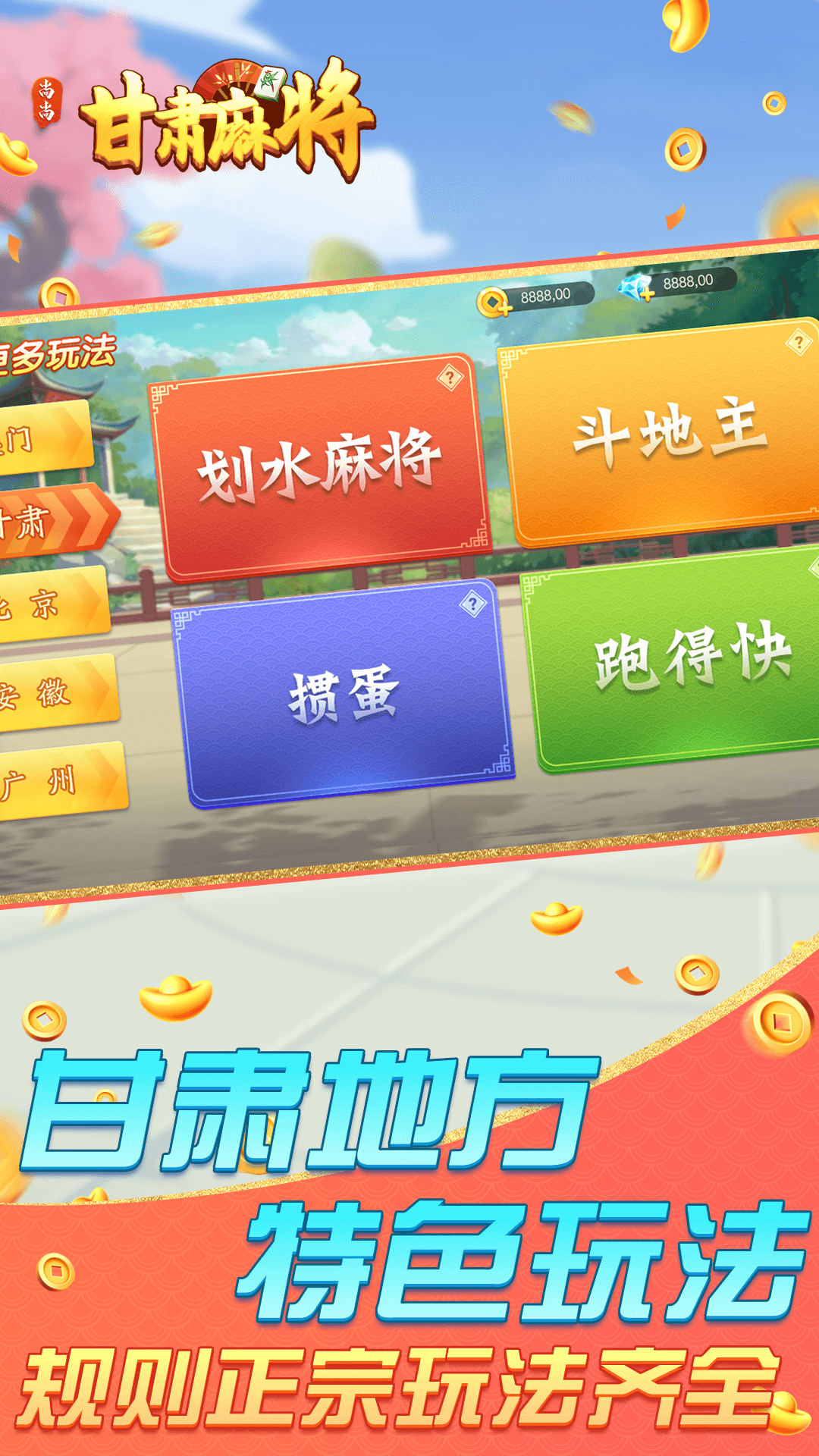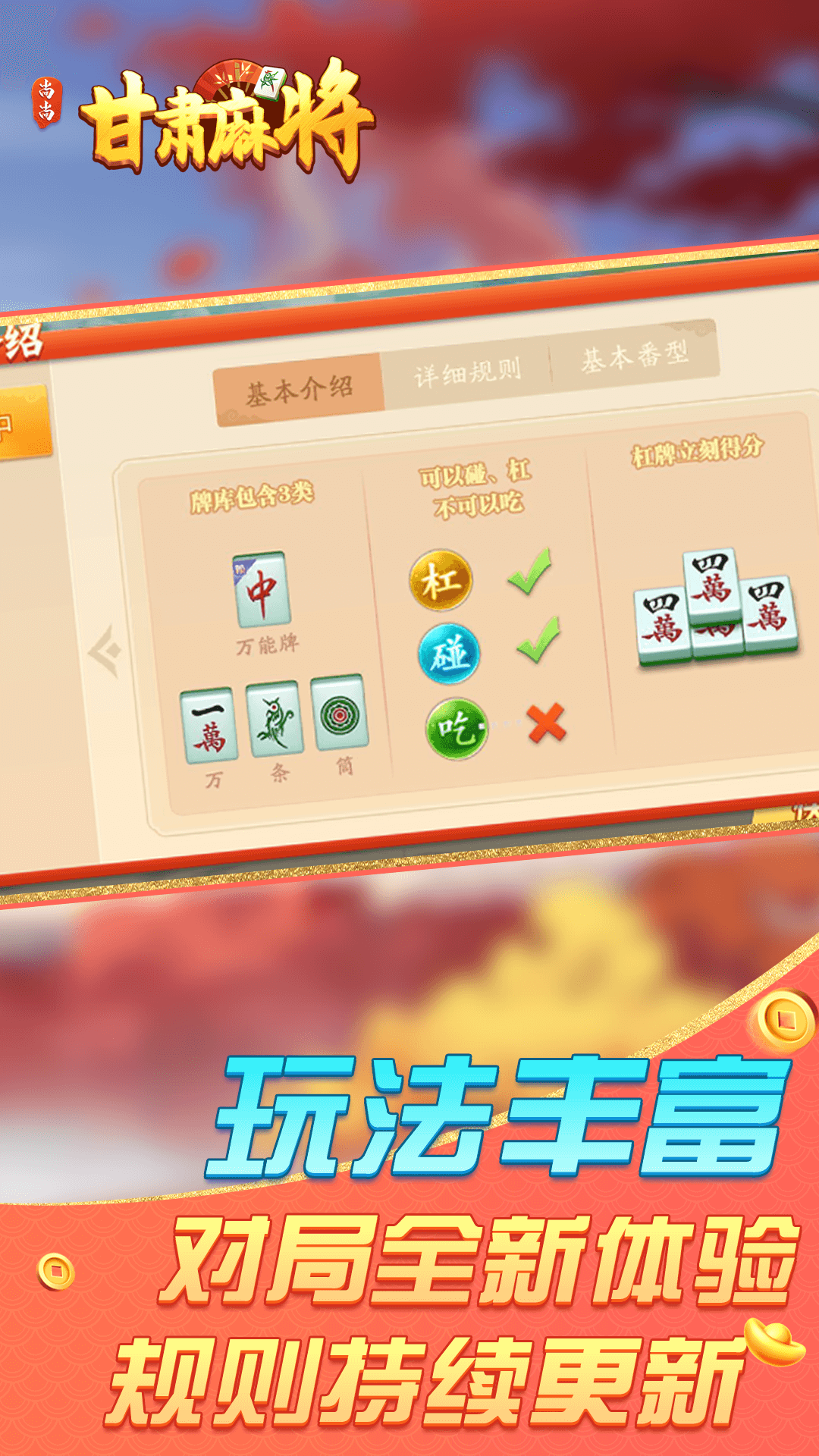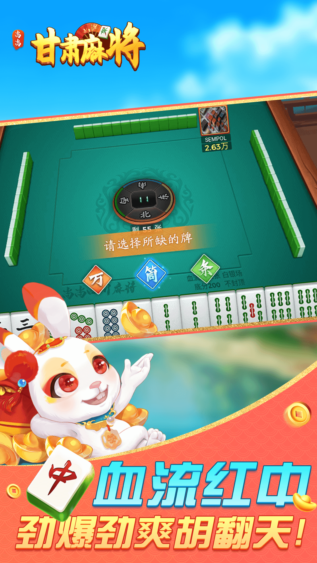 全国火热的甘肃麻将,包含血流红中、血流成河、血战到底等多种经典玩法。可以好友对战,也可全国匹配,快来体验吧。 【热门玩法 应有尽有】 斗地主、掼蛋、推倒胡、血流红中、血流成河、跑得快,热门玩法应有尽有。还有更多火热玩法即将推出。 【精美画质 福兔相伴】 酷炫特效,超萌牌宠,精美画面,让你体验丝滑般的麻将扑克体验 【甘肃麻将规则 玩法正宗】 划水麻将、掼蛋、斗地主。深入本地特色,玩法正宗齐全。