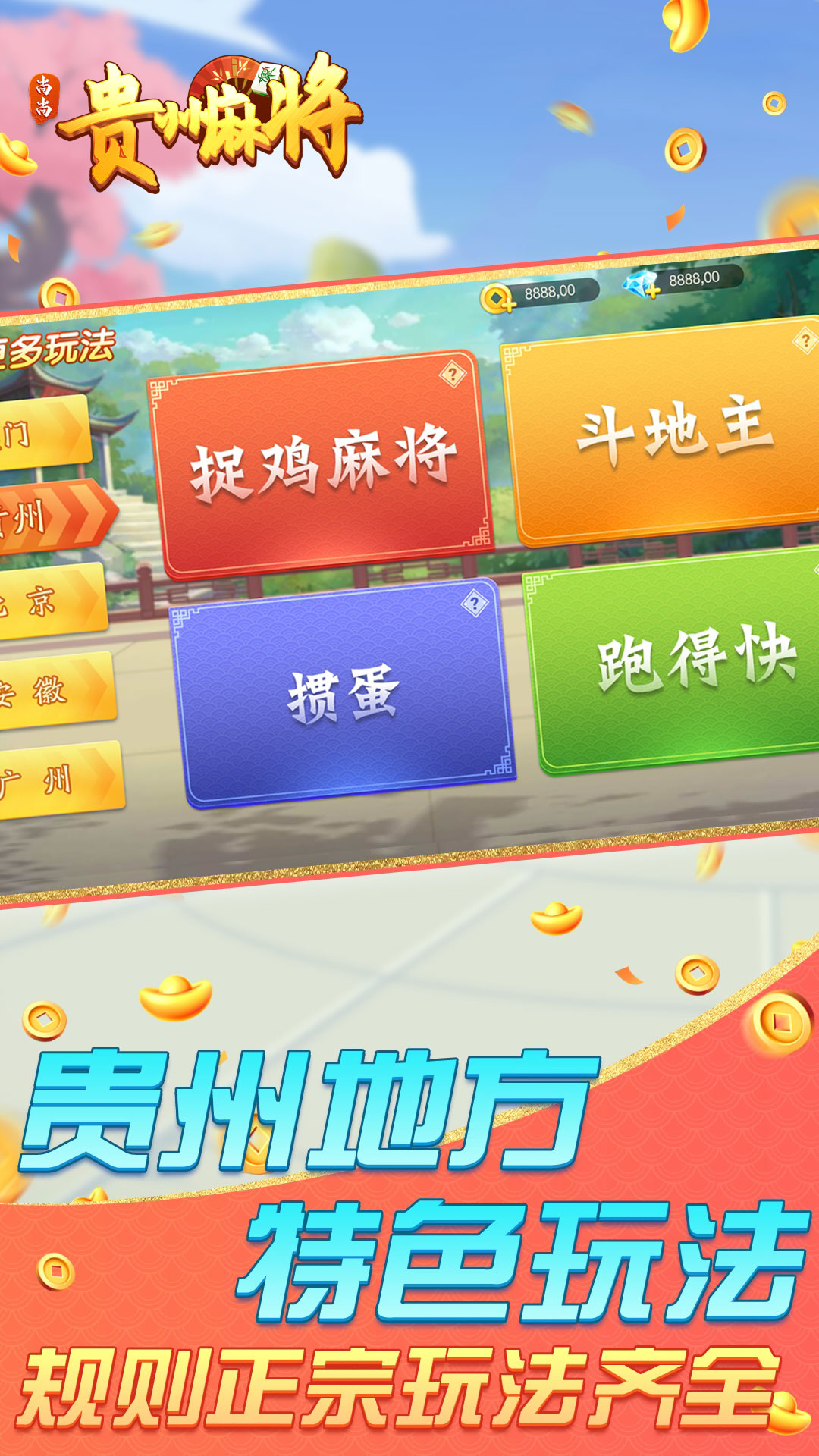 全国火热的贵州麻将,包含血流红中、血流成河、血战到底等多种经典玩法。可以好友对战,也可全国匹配,快来体验吧。 【热门玩法 应有尽有】 斗地主、掼蛋、推倒胡、血流红中、血流成河、跑得快,热门玩法应有尽有。还有更多火热玩法即将推出。 【精美画质 福兔相伴】 酷炫特效,超萌牌宠,精美画面,让你体验丝滑般的麻将扑克体验 【贵州规则 玩法正宗】 捉鸡麻将、掼蛋、斗地主。深入本地特色,玩法正宗齐全。