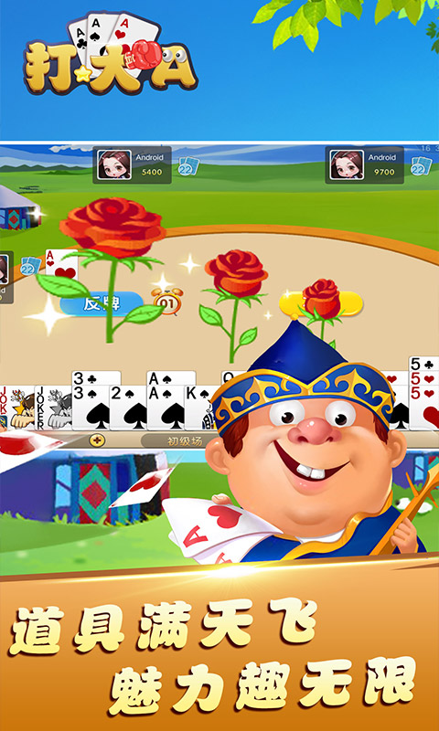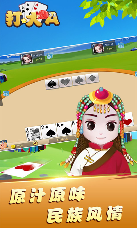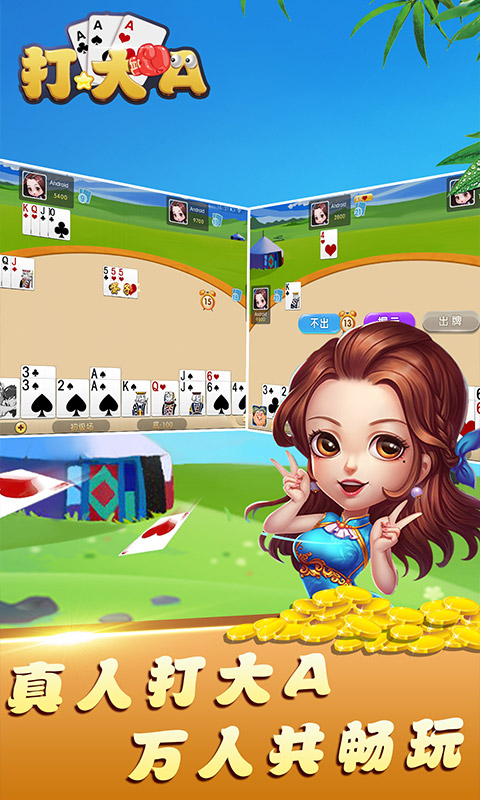 《打大A》又称“大A王”“打大1”“打大幺”“打大尖“等,跟拉克,打弹子等同为内蒙地区流行的棋牌游戏。是一种可玩性极强的纸牌玩法,策略性和竞技性同样十分出色,喜欢棋牌游戏的玩家一定要体验下本作,将会带给你不同的感受!