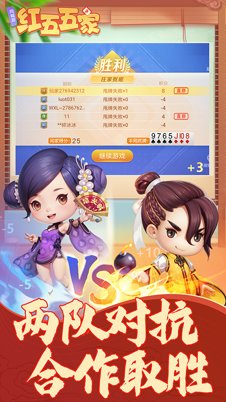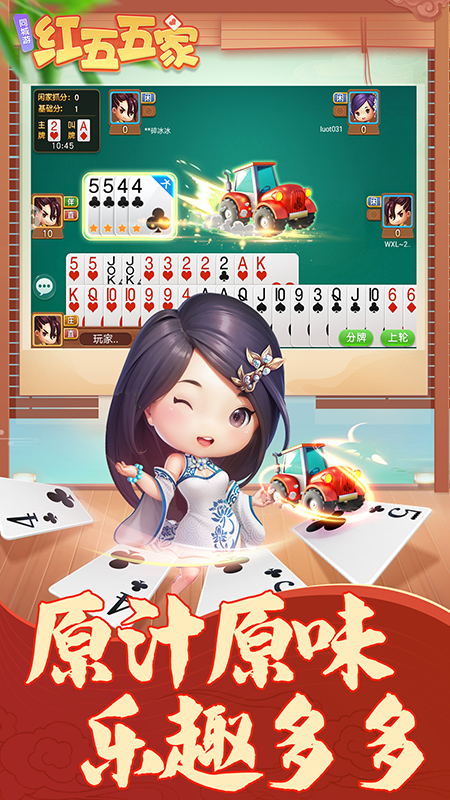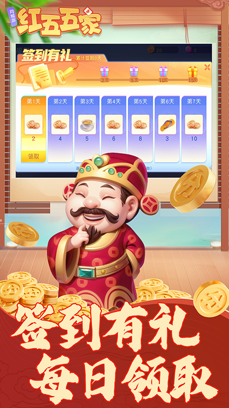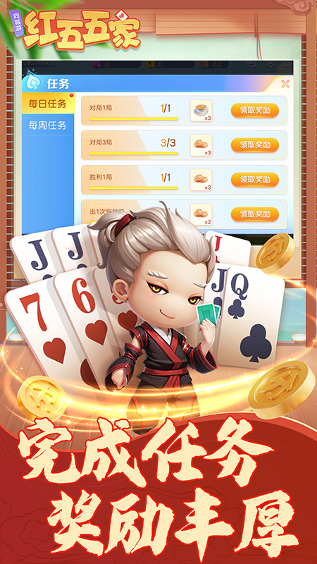 红五五家是一种扑克牌游戏,属于同城游升级类扑克牌类型,一般情况五位玩家参与游戏,在台州黄岩及浙江各地都较为受欢迎。红五五家级牌永远打2,且红五最大。每一轮由第一个亮牌的玩家坐庄。在叫主结束后,庄家抓进7张底牌,再选出7张不要的牌扣下。埋下底牌后,底牌只能由庄家查看,且不能更改。庄家出牌前指定A、K、红桃五、大王中得一张来寻找伙伴。第一轮牌由庄家方首先出牌,按逆时针顺序轮流出牌,以后每轮牌都由前轮获胜方首先出牌。玩家可出的牌型有单张、对子、三条、二拖拉、三拖拉、带柄拖拉、甩牌。各方都出牌后,计算获胜方,下一轮牌由获胜方首先出牌。首家甩牌,则需要优先跟同花色的相同牌型的牌。没有同花色的牌则可以垫牌,毙牌。所有人出完牌时,游戏结束,在出最后一回合牌时,如果是抓分方获胜,则底牌被“抠底 ”。底牌中的分乘以2计入闲家抓分。