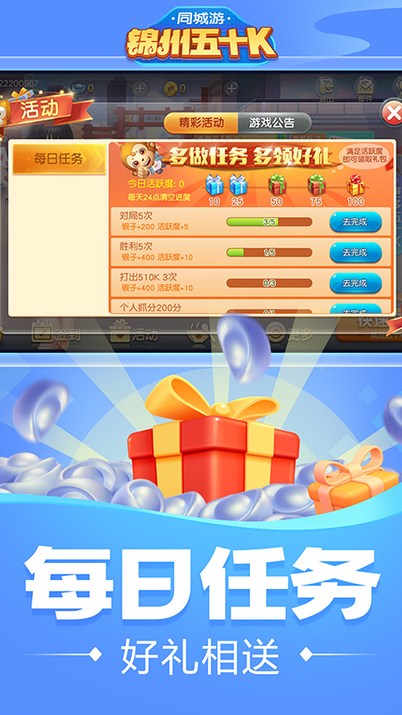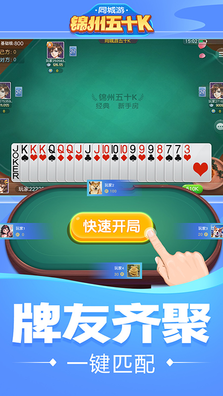 同城游锦州五十K是一款流行于锦州及锦州附近的纸牌游戏,同城玩家实时对战,激情不减,刺激无限;产品覆盖了国内大多数地方棋牌游戏,包含了斗地主、麻将、双扣等多款棋牌游戏玩法,游戏画面清新唯美,操作简单易上手,同时也是地方牌扑克游戏和休闲拼图的好选择。 游戏特色 【家乡棋牌】包含国内大多数地区的地方玩法,在线过招娱乐休闲 【免费好礼】惊喜福利天天送,玩法多多乐无穷 【真人秒开局】线上真人玩家,匹配快,游戏流畅 【画面精美】感受不一样的地方特色