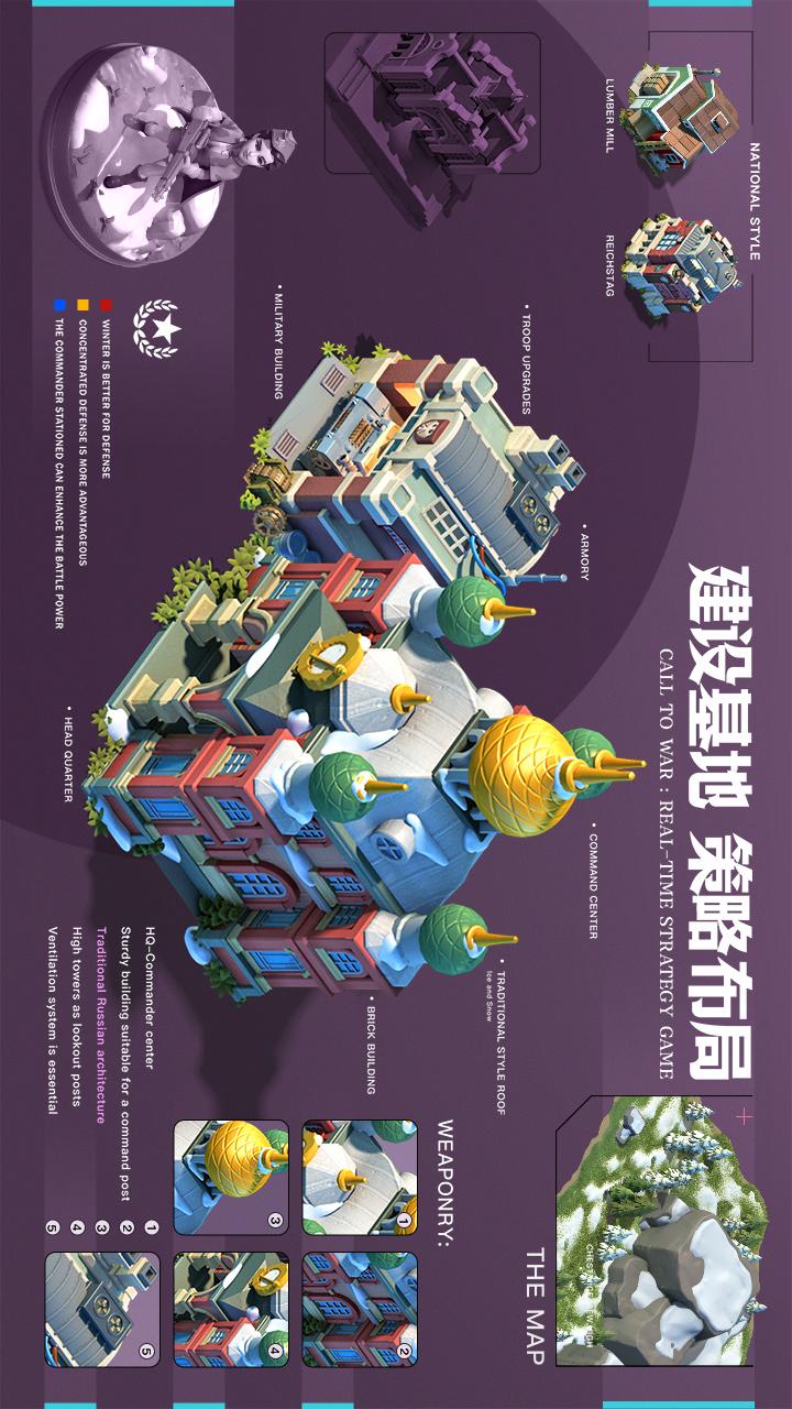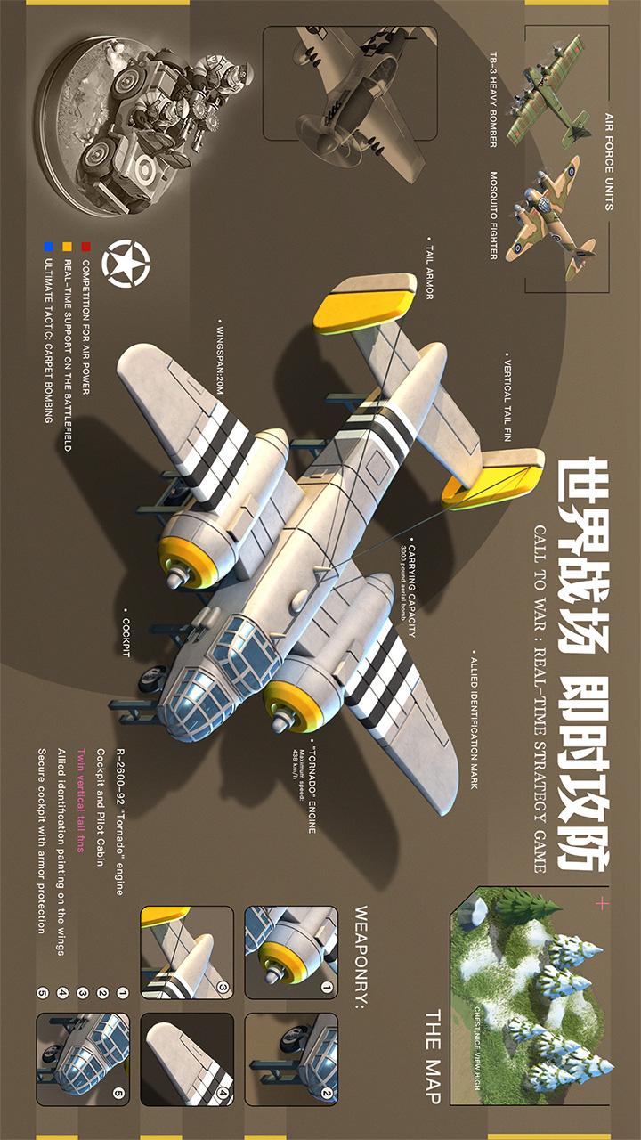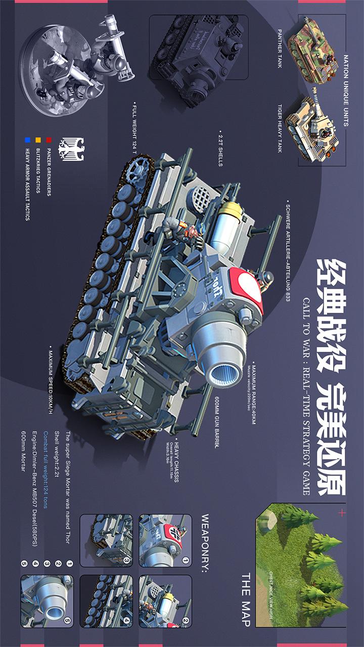 游戏以经典玩法为基石,加入了五大特色阵营体系、特色部队、各国将领和策略性十足的战场增援部队以及军团大作战等创新玩法,呈现出沉浸式战争感的新型战斗体验。