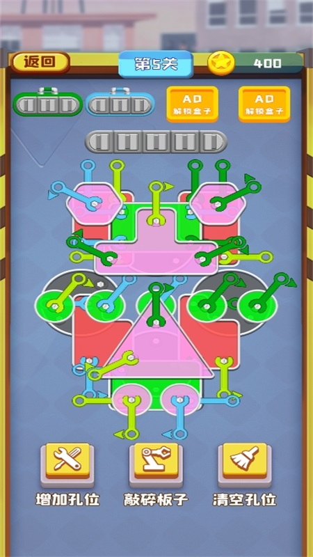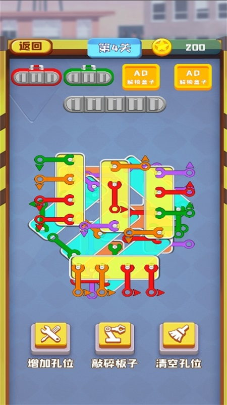 该游戏是一款休闲解压的小游戏,玩家需要把关卡中的扳手全部收集起来才能获得胜利,界面上方有收纳扳手的小箱子,点击对应颜色的扳手,扳手就会按照箭头方向旋转,当扳手成功旋转180度时,螺丝会被拧下来,扳手则会进入对应颜色的小箱子,凑齐三个相同颜色的扳手,就会出现新的小箱子。如果没有对应颜色的小箱子,扳手就会被暂时收纳到下方的格子中,当格子被填满,则游戏失败。所以玩家需要根据扳手的颜色来点击。该游戏考验了玩家的收纳技巧以及逻辑思考的能力。赶紧来体验一下拧扳手的乐趣吧!