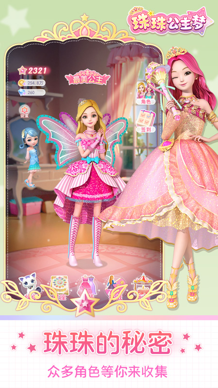 收集珠珠,莉莉,莎莎,艾琳,罗莎等等所有的角色,在跑酷中选择漂亮的衣服,赢取更多金币,购买更多漂亮衣服,把大家装扮的美美的。别忘了,童话镇和等待解救的星座女神,帮助她们,你也可以获得她们的回报。与泰罗要好好相处,他是我们的好伙伴。
