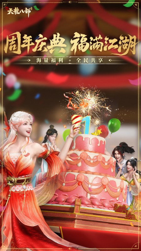 新天龙迎来自己的周岁生日,周年庆典主题月隆重开启!洛阳广场装扮一新, 参与庆典的少侠不仅可以和好友们分食蛋糕,还可以领取限定武饰等超多福利,快来一起狂欢吧!