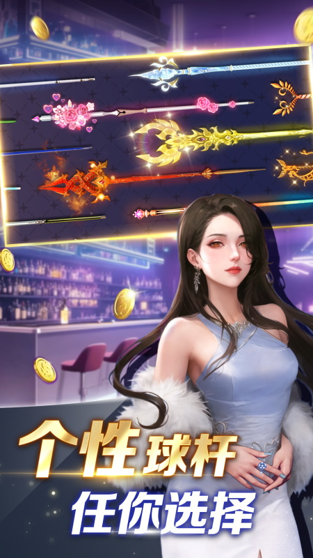 丰富玩法选择,给你超多乐趣、经营球室玩法,成为台球大亨大量球杆皮肤,尽显你的个性