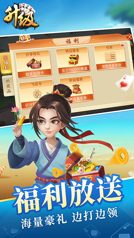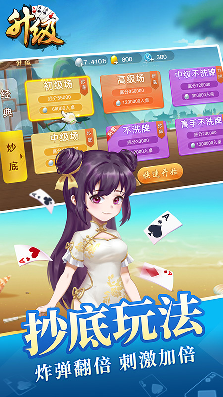 升级又名双升、拖拉机、80分。在全国都有各种规则玩法和叫法。通用规则采用含大小王的整副扑克牌进行游戏,可以使用1-4副牌不等,本游戏使用最为流行的2副牌打法。2副牌升级又称拖拉机、80分、双升等。游戏者共四人,相对的两人为一组。游戏的目的是赢得一局后“升级”,一般以先升到A的一方为赢家。
