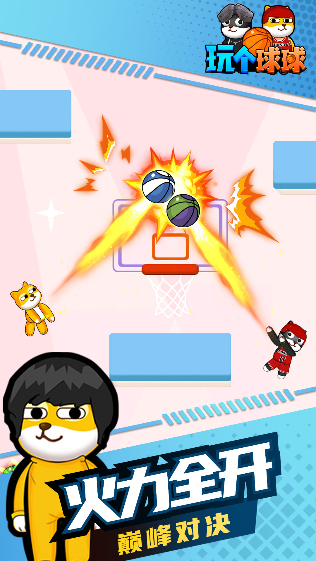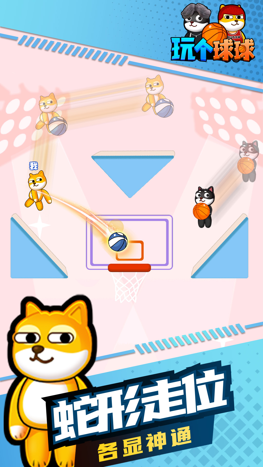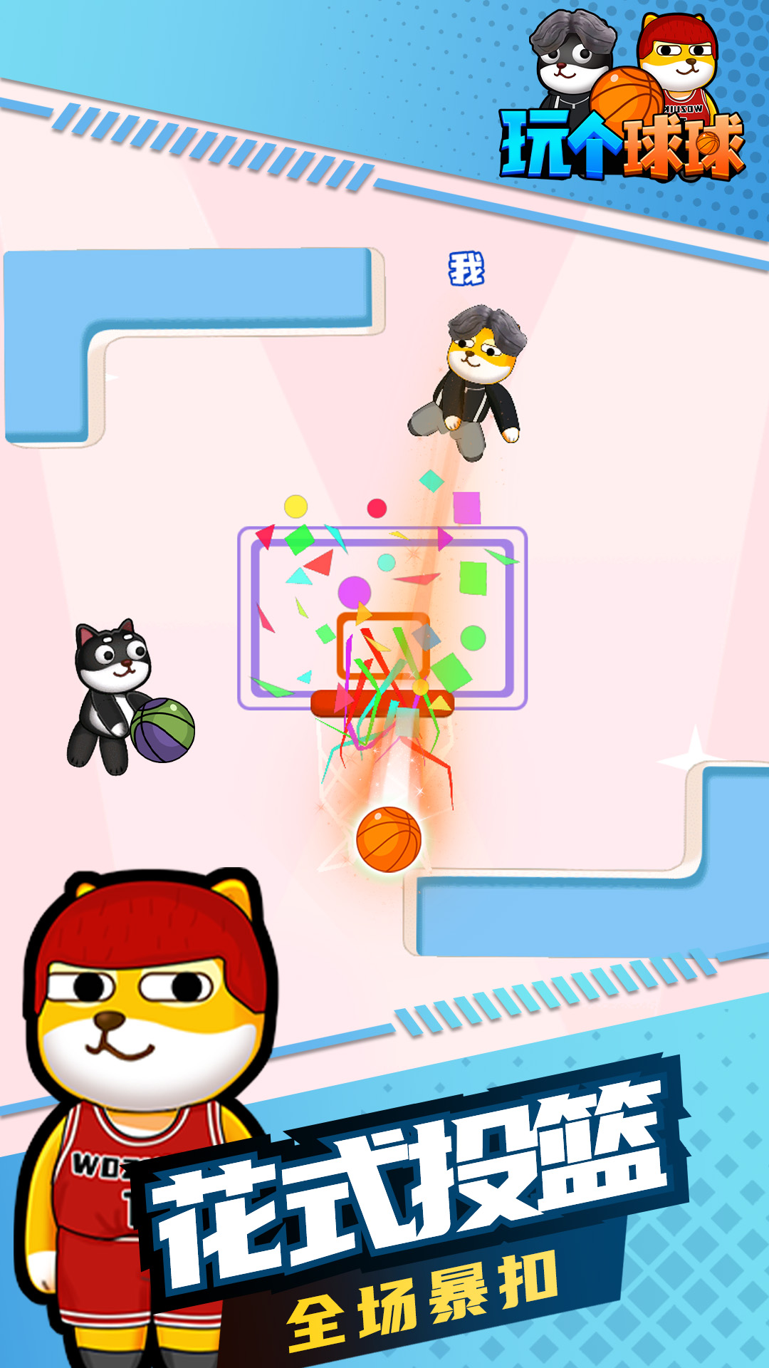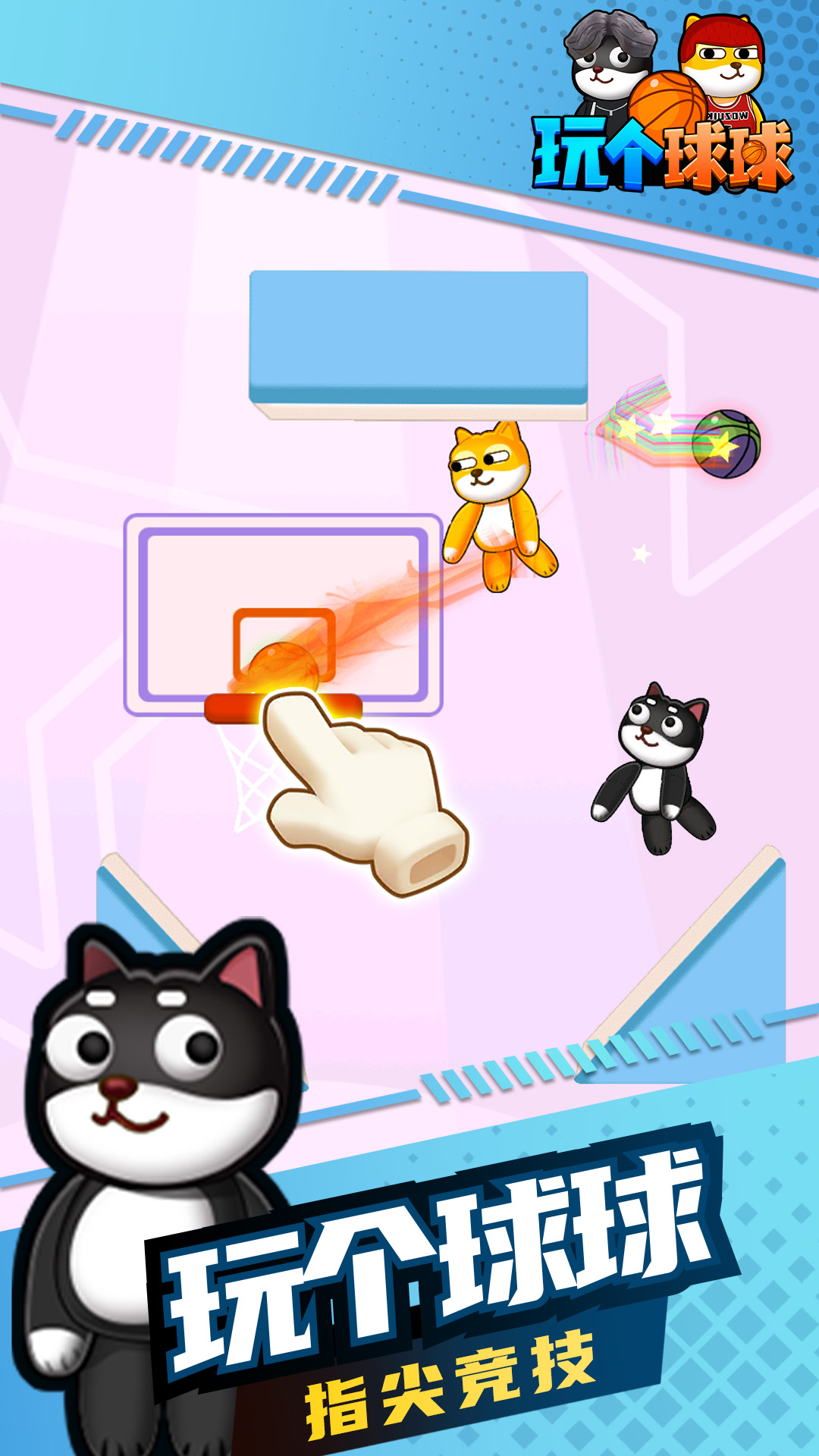 Hey bro,躺着也能感受篮球的魅力! 控制狗狗球员进行一场无规则的1V1篮球比赛,谁先投入三个球即可获得胜利。投篮过程中要注意躲避对手攻击,或者主动发起进攻! 在家就能练习,多种投篮姿势供你学习体验。玩法极其简单,手指点击屏幕,快速投篮看看你的手指灵活度。 想怎么玩就怎么玩,花样投篮各显神通,各种意想不到的进球姿势让全场为你欢呼!
