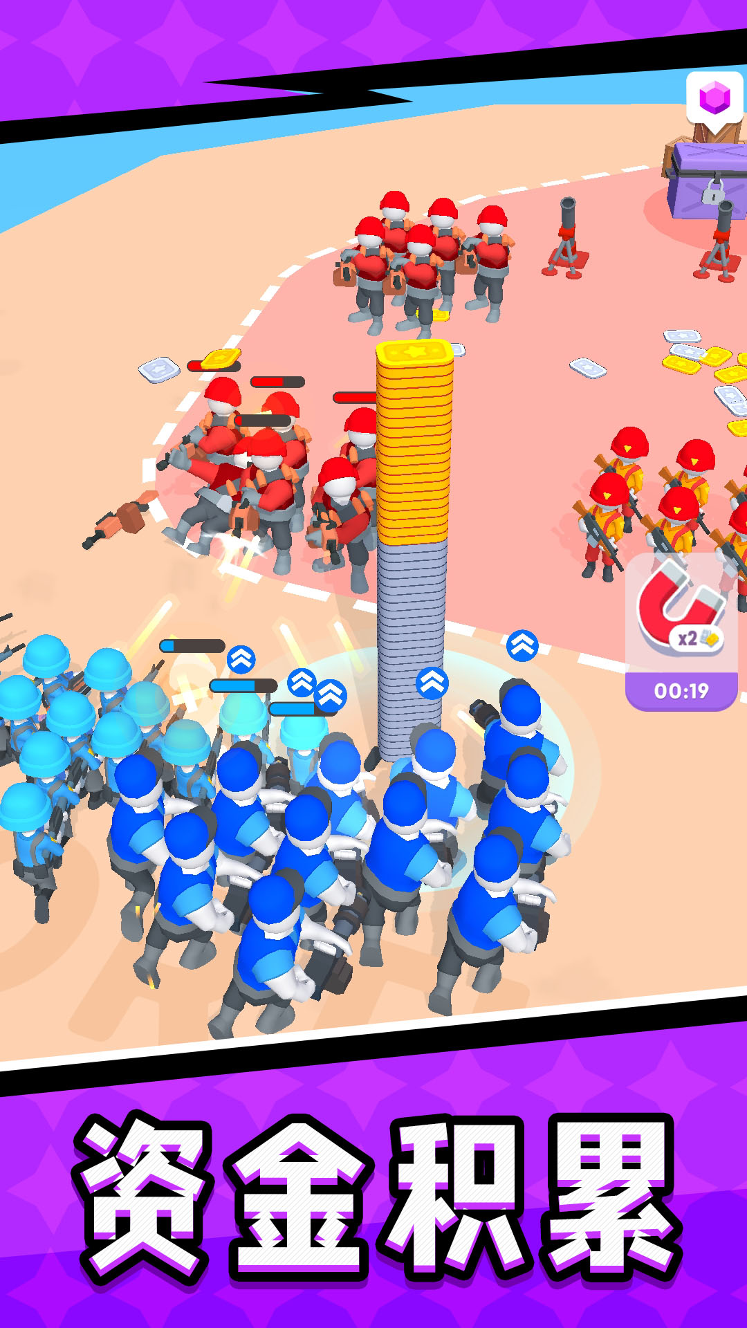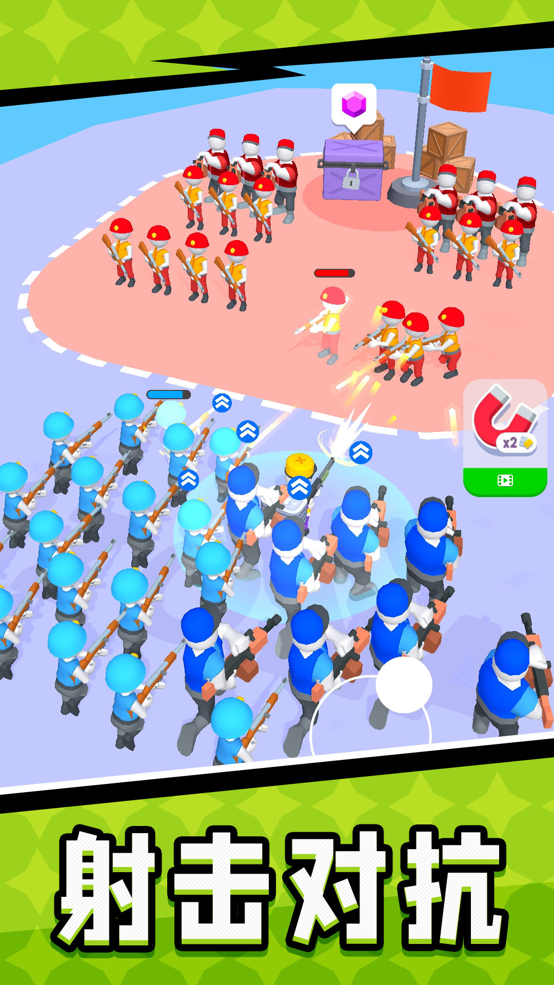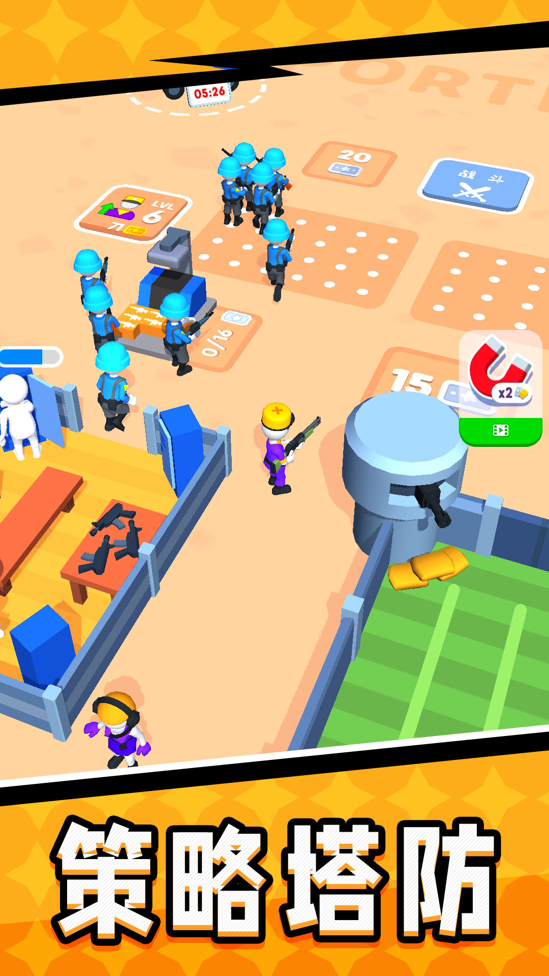一款休闲射击类战斗对局游戏,玩家需要在游戏中组建自己的部队,利用不同的战术和阵容,对抗敌人的进攻,并保卫自己的基地,游戏中有多种不同类型的士兵、坦克和飞机等单位可供选择,每种单位都有其独特的属性和战斗技能。玩家需要根据实际情况,合理地调配各种单位,以最大化地发挥它们的作用。