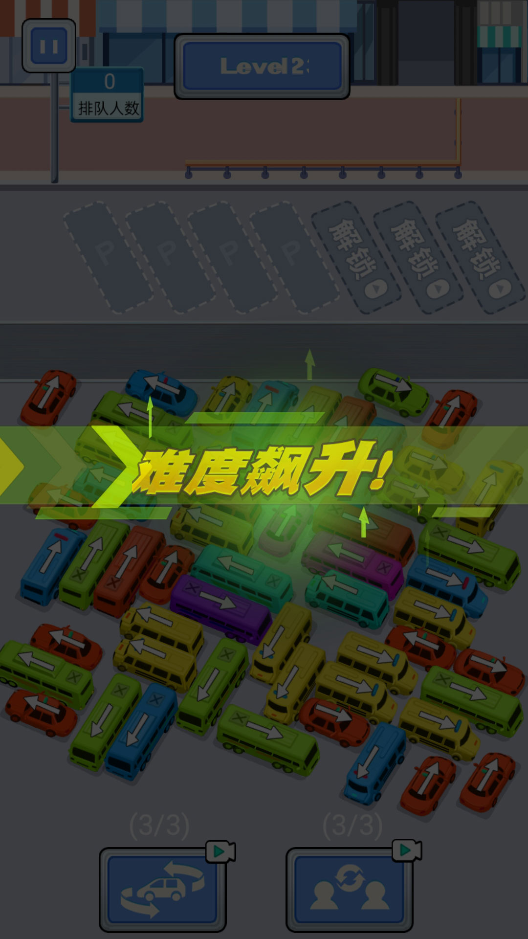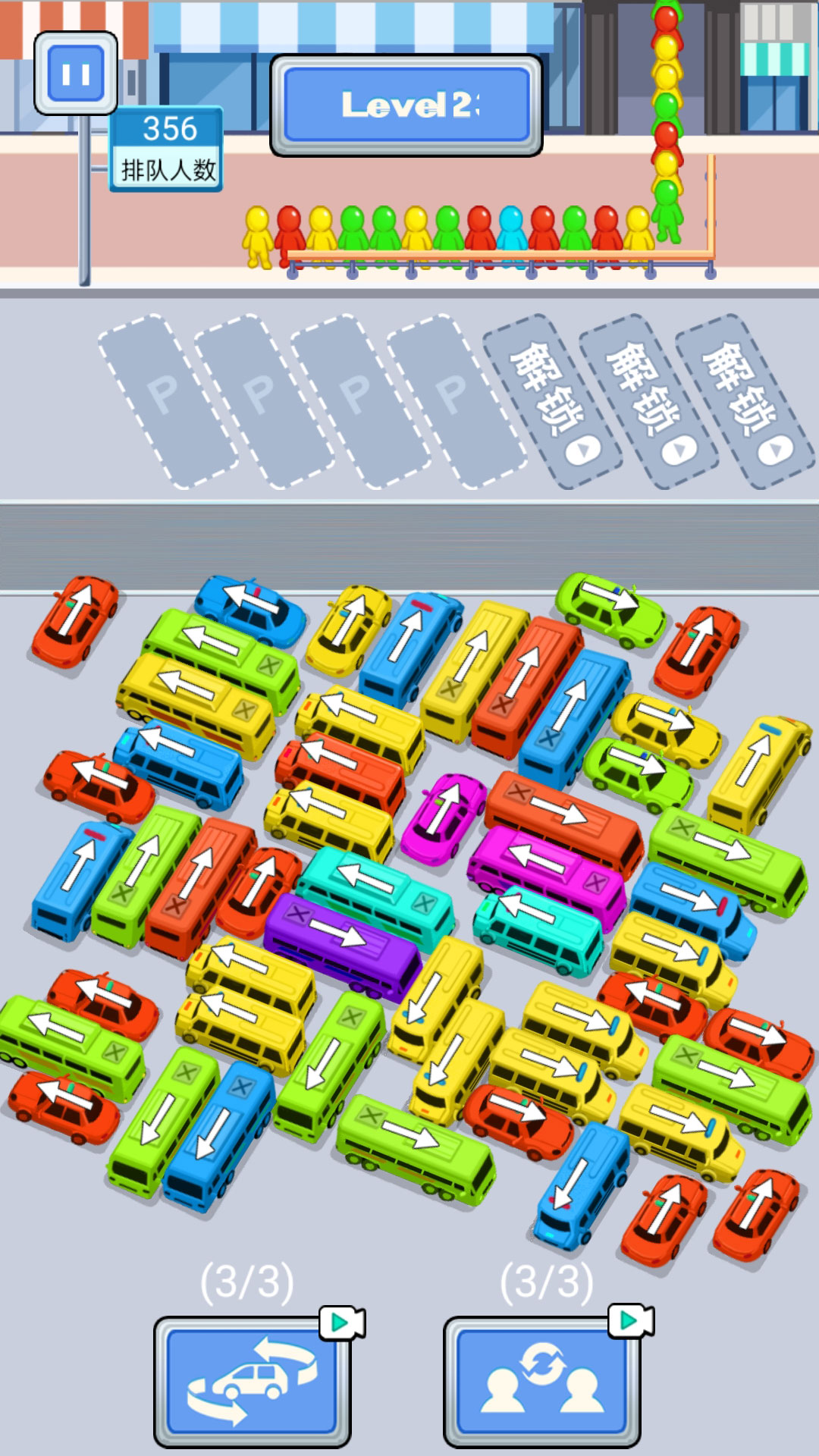 在繁忙的停车场,按照颜色和箭头统筹汽车出站顺序,按照指定顺序接送乘客。