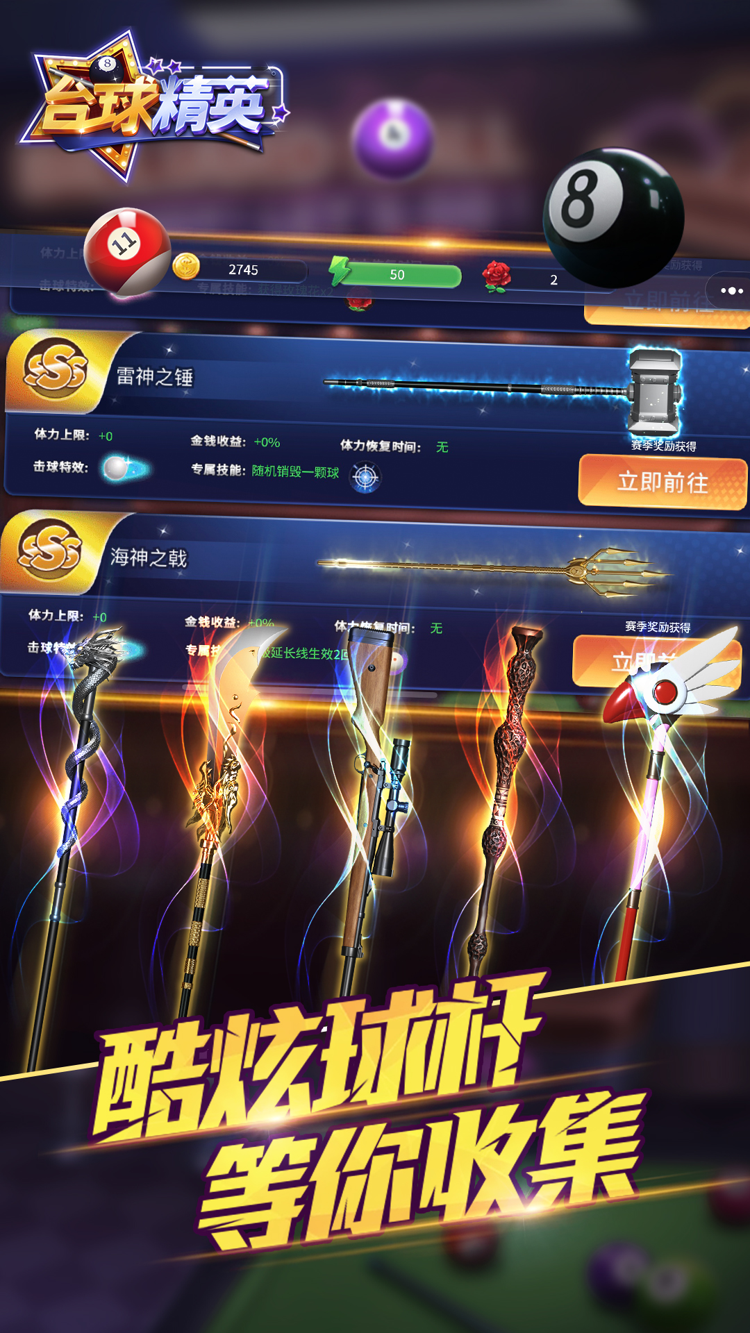 巧夺天工,杆杆酷炫。游戏中配置多种属性、不同品质外形的球杆和球桌,分分钟体现你的个性!
