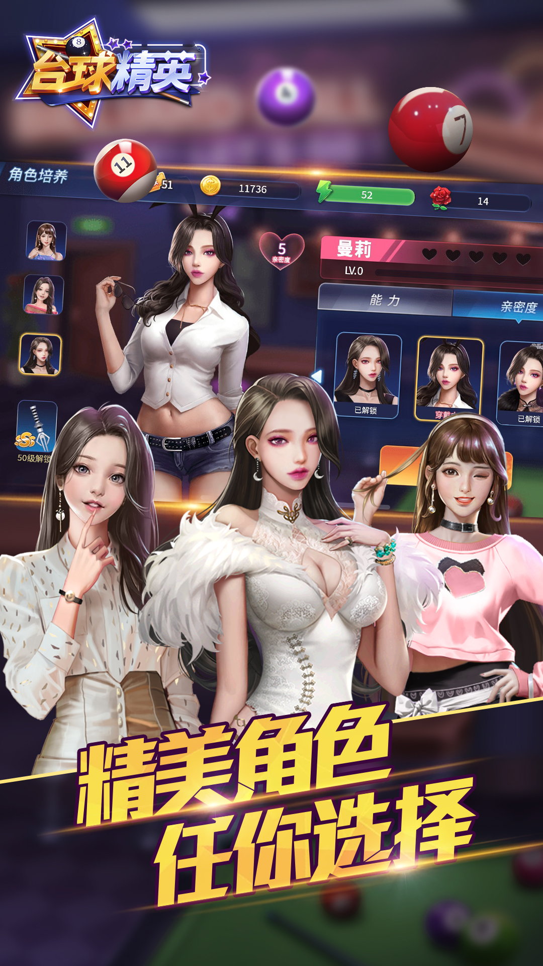 逼真的人物造型,不同的能力属性,让你更好的成为台球高手!