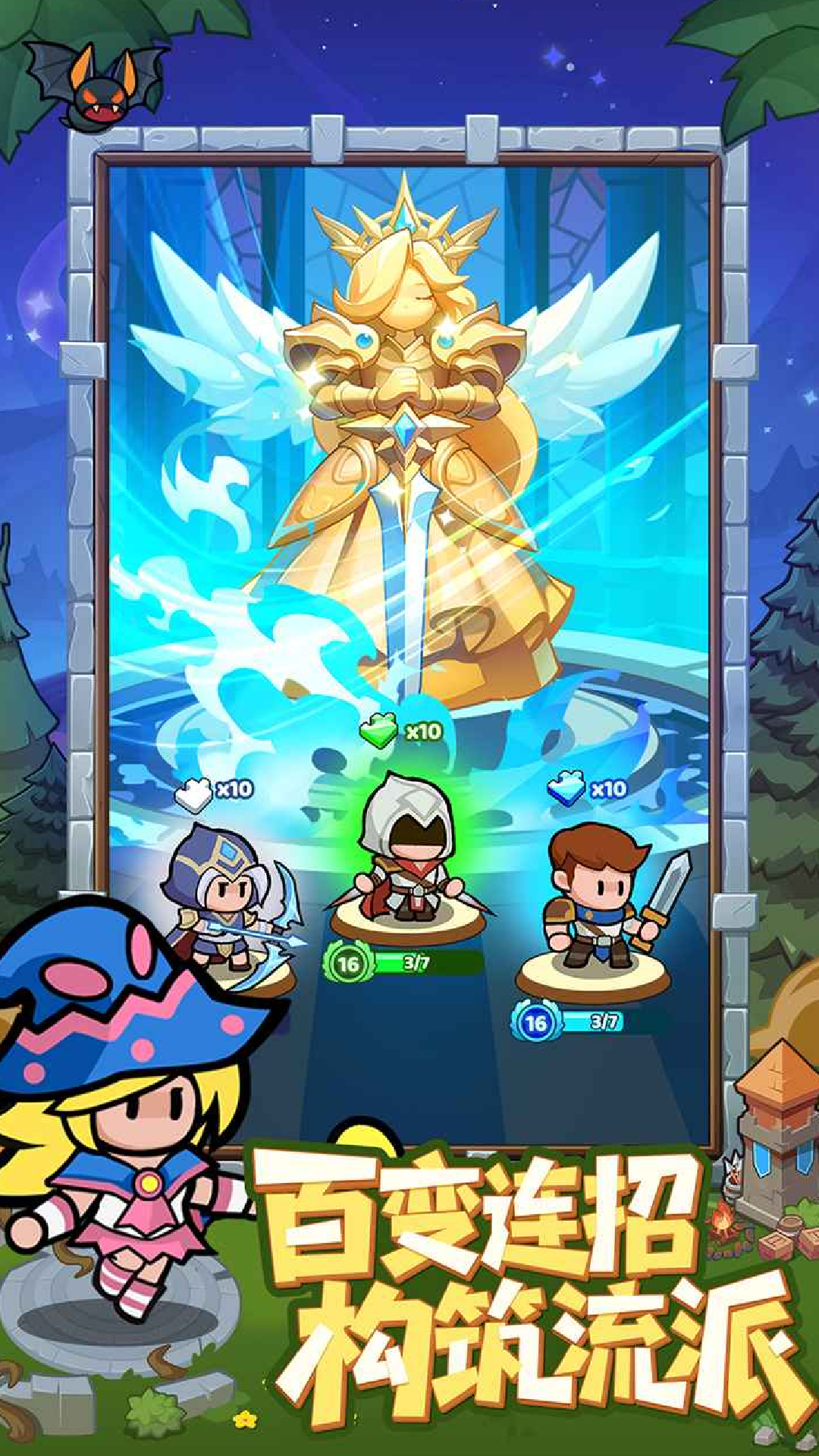 卡牌抉择系统:每次升级都能从三张随机卡牌中定制王国,卡牌包括建造奇幻建筑、赋予士兵战场专精、触发扭转战局的奇迹等。