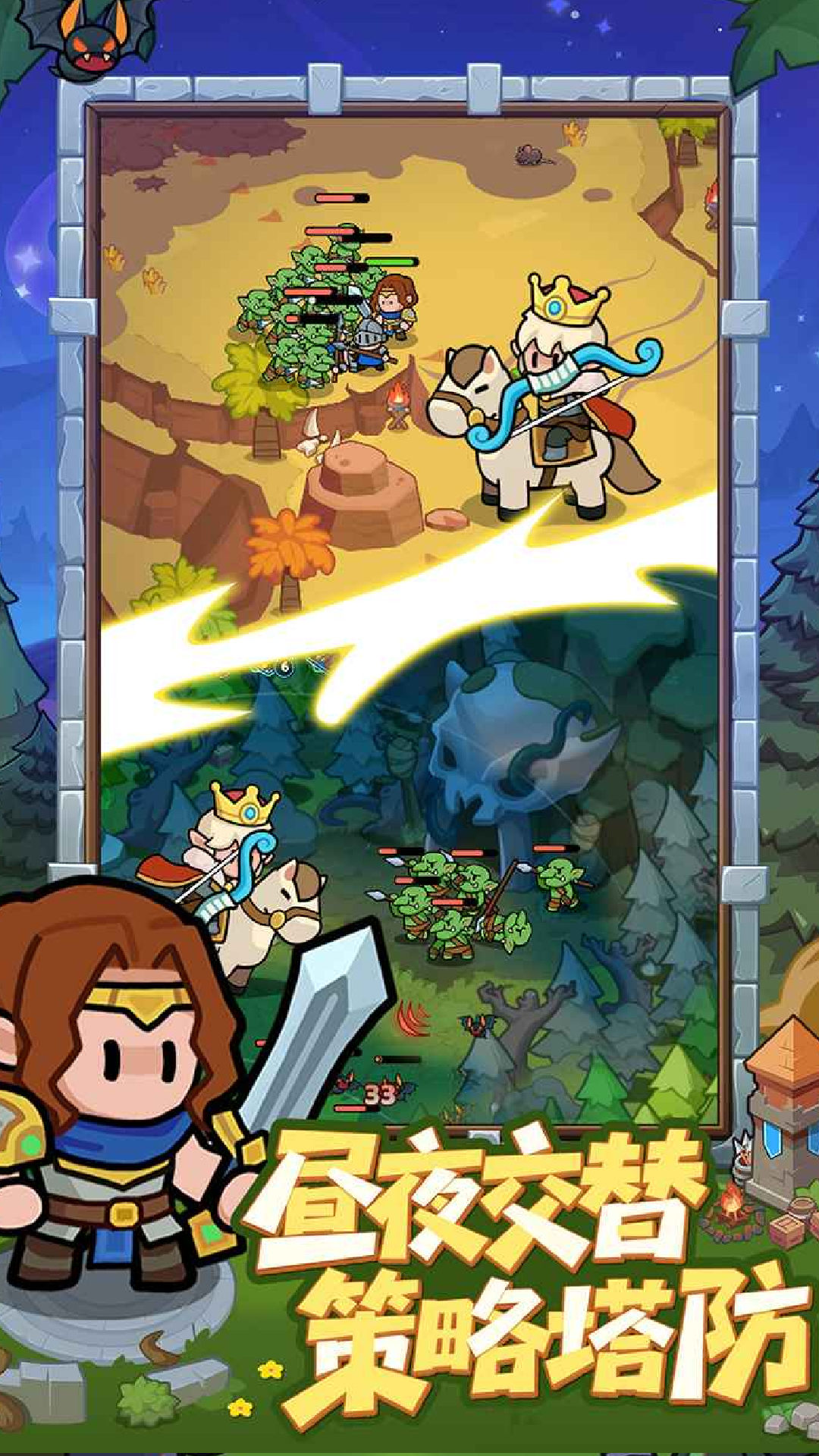 昼夜双循环玩法:白天玩家需争分夺秒地规划防线,建造兵营召唤将领与士兵,架设固定炮塔;黑夜降临时,玩家要亲自率领军队冲出堡垒,与怪物展开生死搏杀。