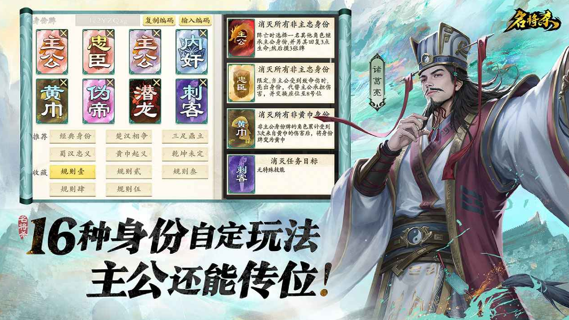 名将杀是一款多人身份推理策略卡牌游戏,玩家可以扮演中国历史名人,通过打出手牌、判断身份、达成身份的胜利条件来获得游戏胜利。游戏特点包括三持武器自由搭配,每个武将可以装备3张任意类型的装备牌,自由搭配,效果叠加,任何武将都可以横扫全场。此外,游戏拥有16种身份阵营博弈,包括主公、忠臣、反贼、刺客、黄巾等,每种身份都有独特的胜利目标或者身份效果,为经典身份推理的玩法增加更多不同可能与乐趣。